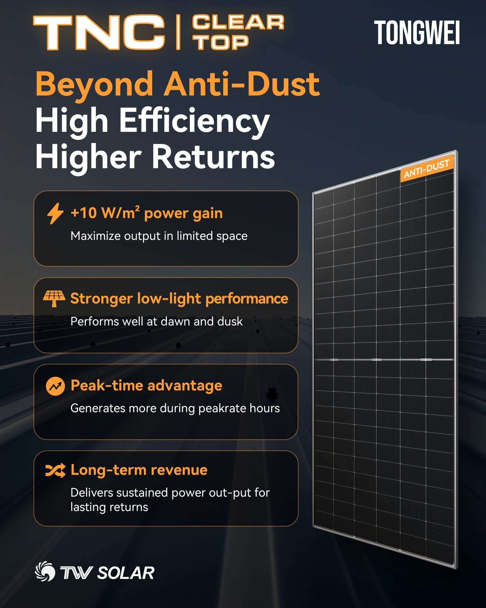 Visoko učinkoviti paneli za maksimalno konverzijo sončne v električno energijo. Polovične celice povečujejo izpostavljeno površino, N tip zmanjša temperaturno občutljivost in degradacijo z leti.